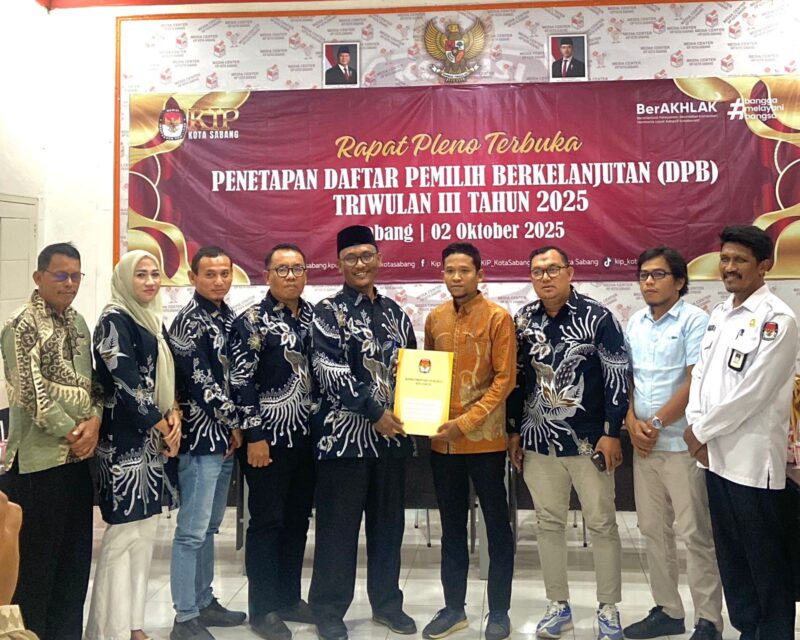 Sabang – wartasabang.com| Komisi Independen Pemilihan (KIP) Kota Sabang menggelar Rapat Pleno Terbuka Penetapan Daftar Pemilih Berkelanjutan (DPB) Triwulan III Tahun 2025, yang berlangsung di Aula Kantor KIP Kota Sabang, Kamis (2/10/2025). Kegiatan ini turut dihadiri oleh jajaran Bawaslu Kota Sabang, Dandim Sabang, Kasat Intel Polres Sabang, Kepala Dinas Dinas Dukcapil, serta Perwakilan Rutan Kota Sabang.